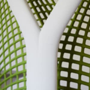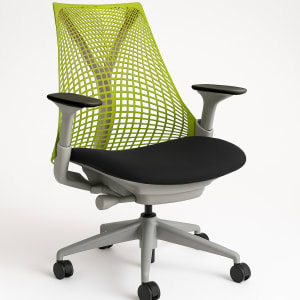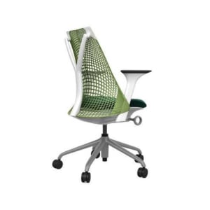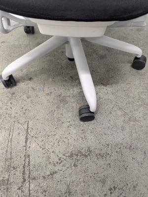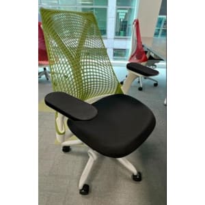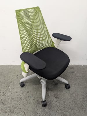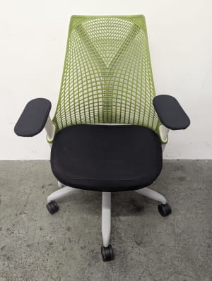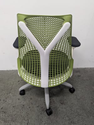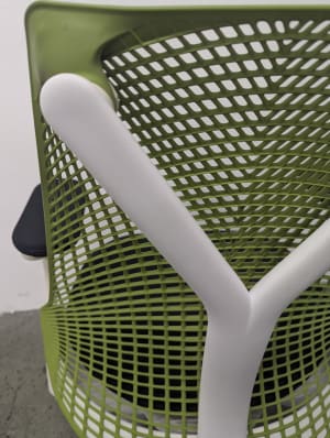 Green mesh back, fog base, white frame, black upholstered seat and arm pads. Grade B condition (minor signs of use consistent with one year of usage. Performance indistinguishable from new).