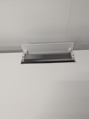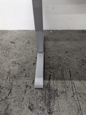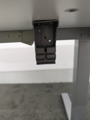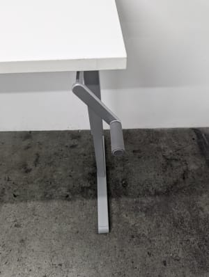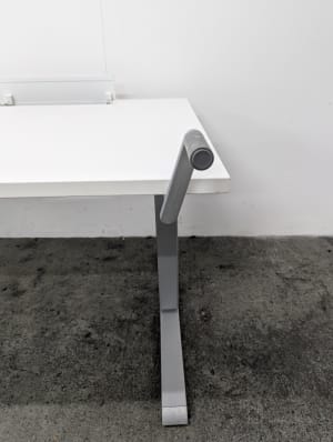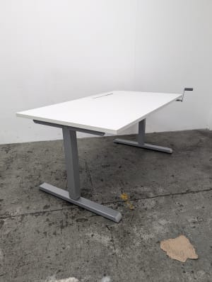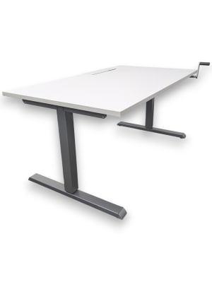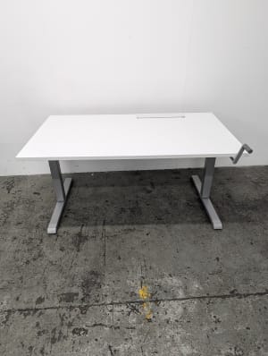 Height adjustable with a crank. Minimum Height: 65cm Maximum Height: 108cm Cable basket not included but a standard basket can be hung from the clips affixed to the underside of the desk.