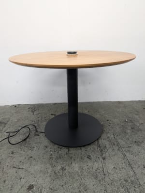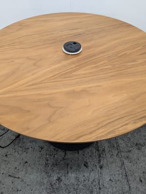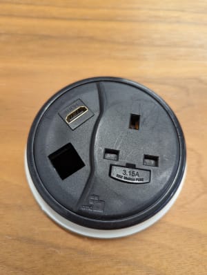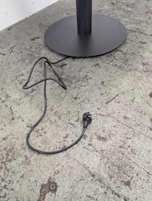 Grade B condition (minor signs of use consistent with one year of usage. Performance indistinguishable from new). Standard plug and port for HDMI cable. Cables run through central column and out underneath the base to connect to a plug.