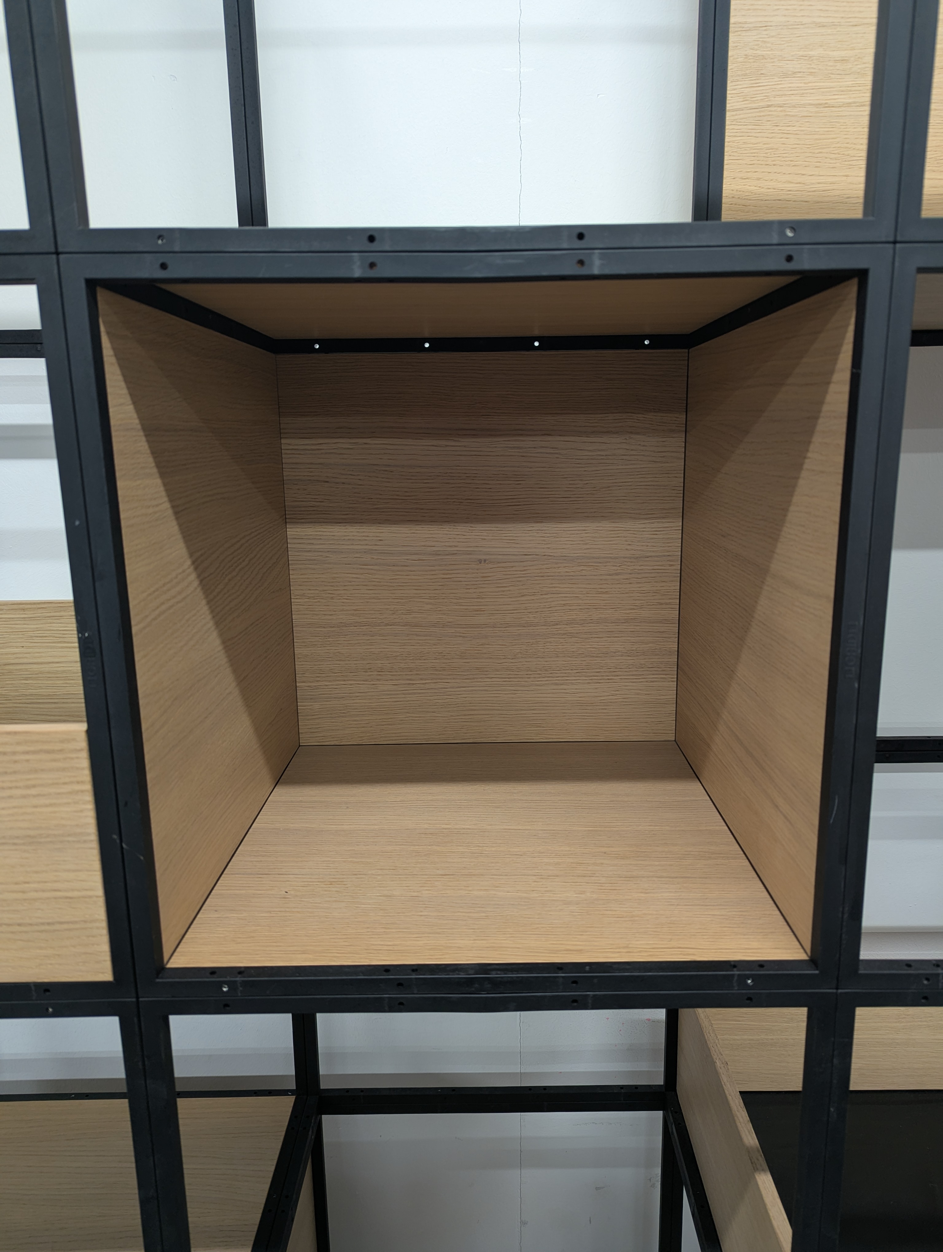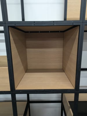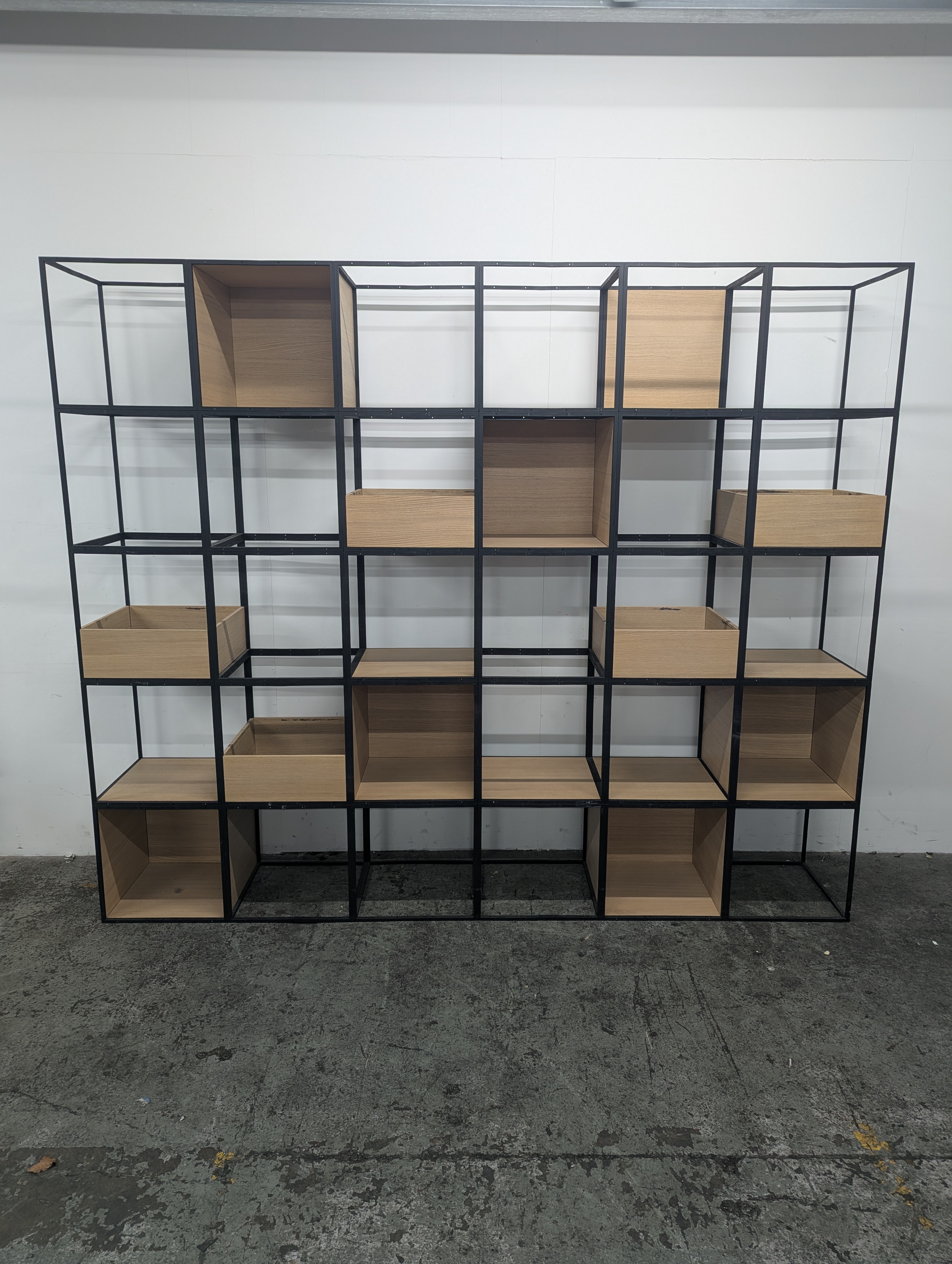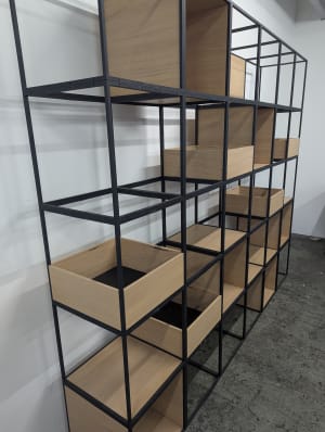 Grade B condition (minor signs of use consistent with one year of usage. Performance indistinguishable from new). Suitable as a two-sided room divider with various storage trays and cubby holes.