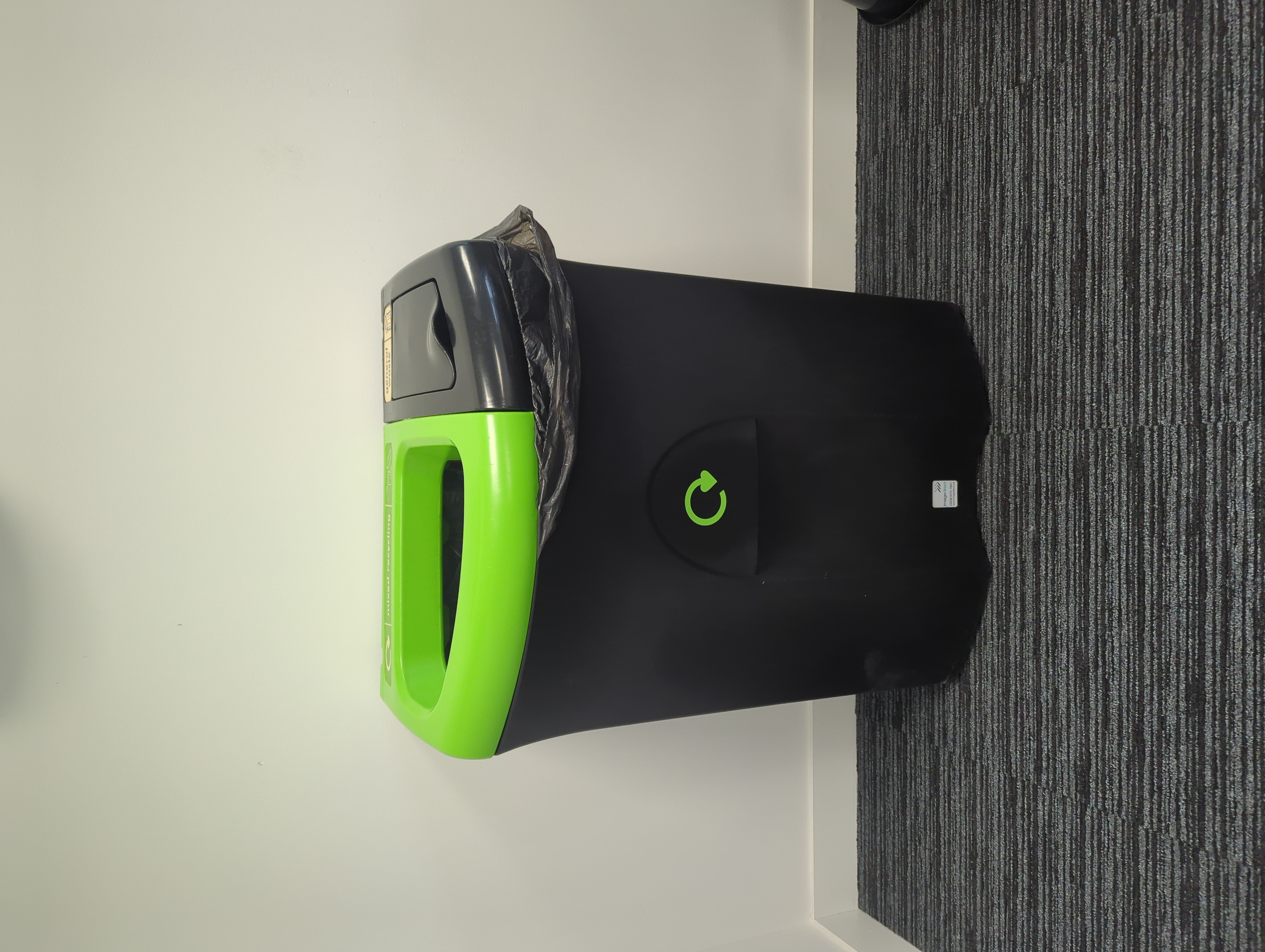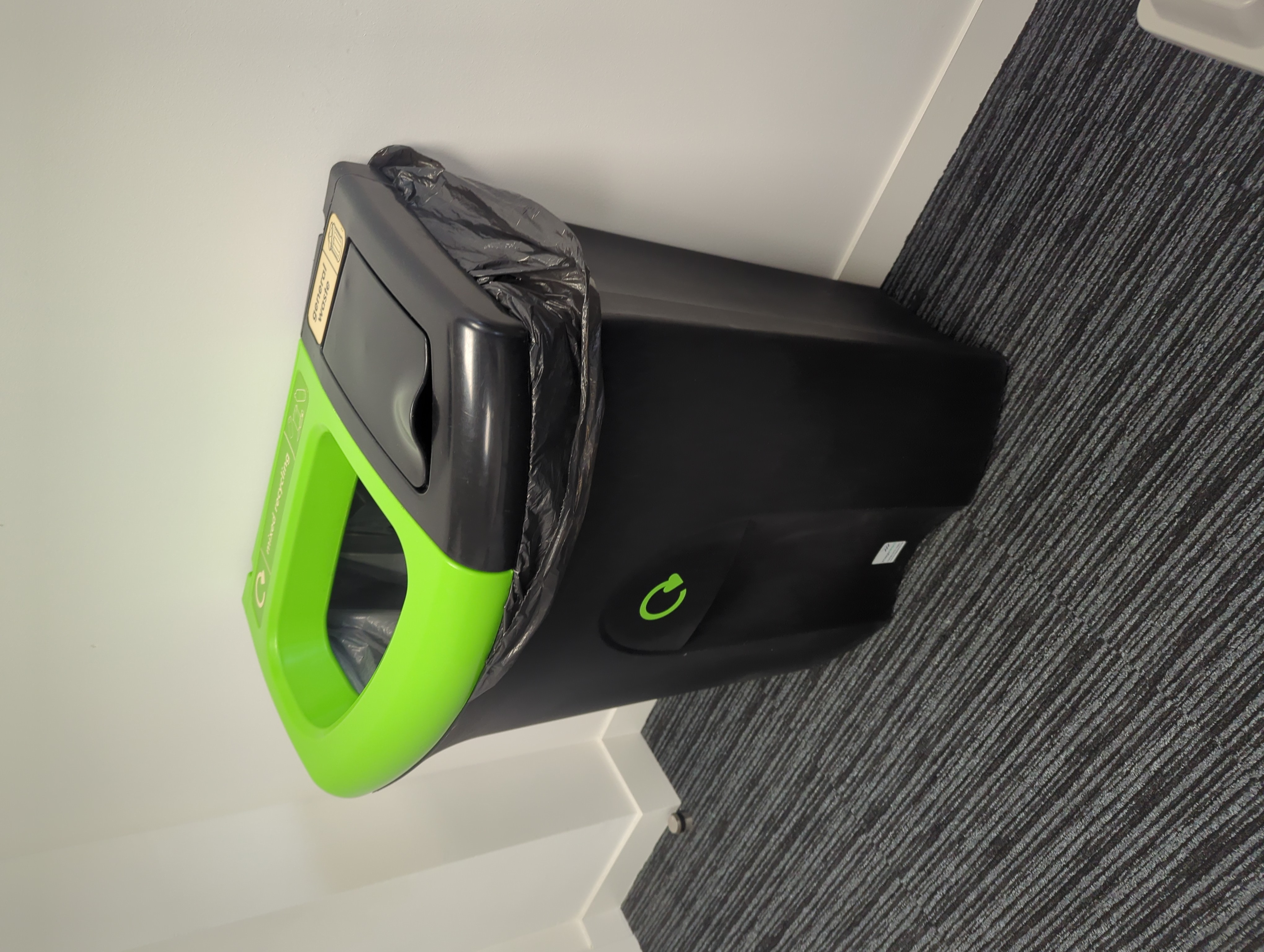 Large compartment for dry mixed recycling, small compartment for general waste.